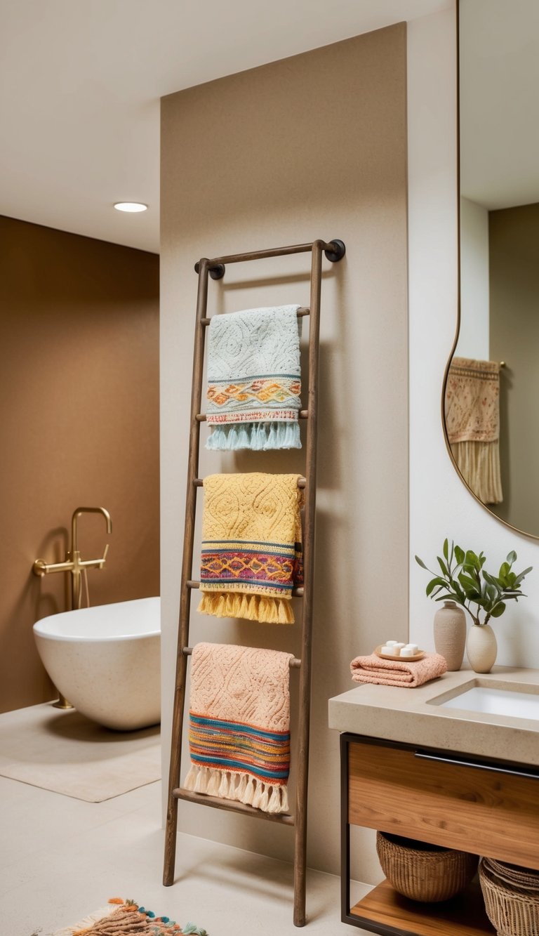 A charming vintage ladder can add a whimsical touch to your boho bathroom. Lean it against the wall and drape colorful Turkish towels over the rungs for a free-spirited vibe.