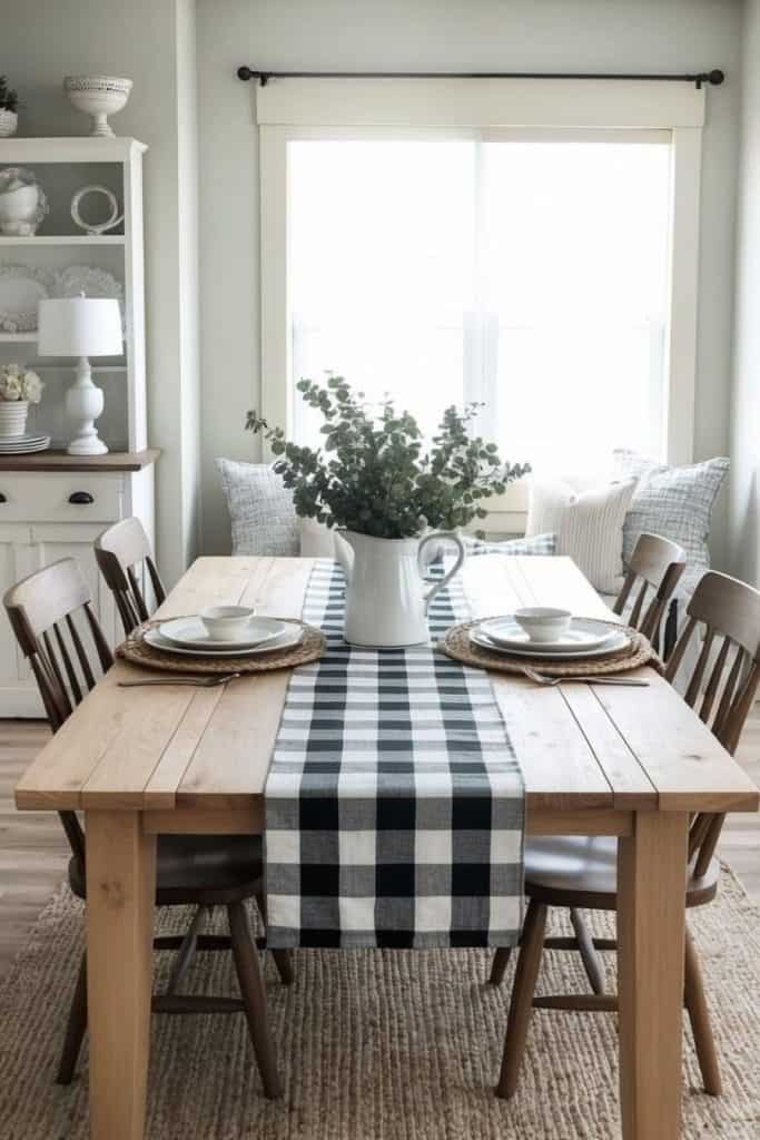 A plaid table runner adds a cozy touch of farmhouse flair to any dining room. Its classic checked pattern brings warmth and rustic charm, perfect for creating an inviting atmosphere.