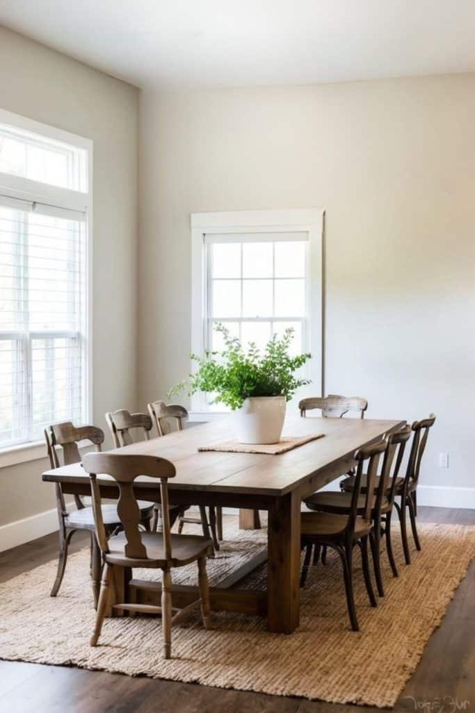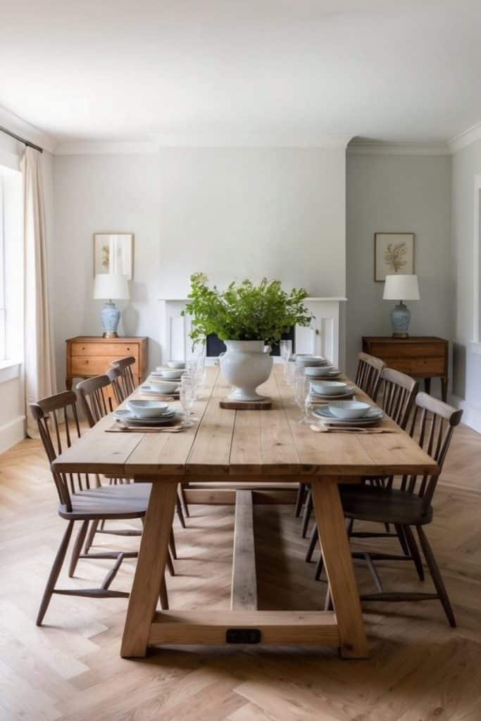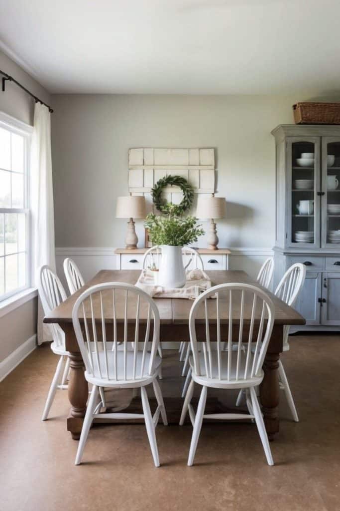 Windsor chairs add a touch of timeless elegance to farmhouse dining rooms. These classic chairs feature spindle backs and wooden seats, creating a charming rustic look. Their simple yet graceful design complements wooden farmhouse tables beautifully.