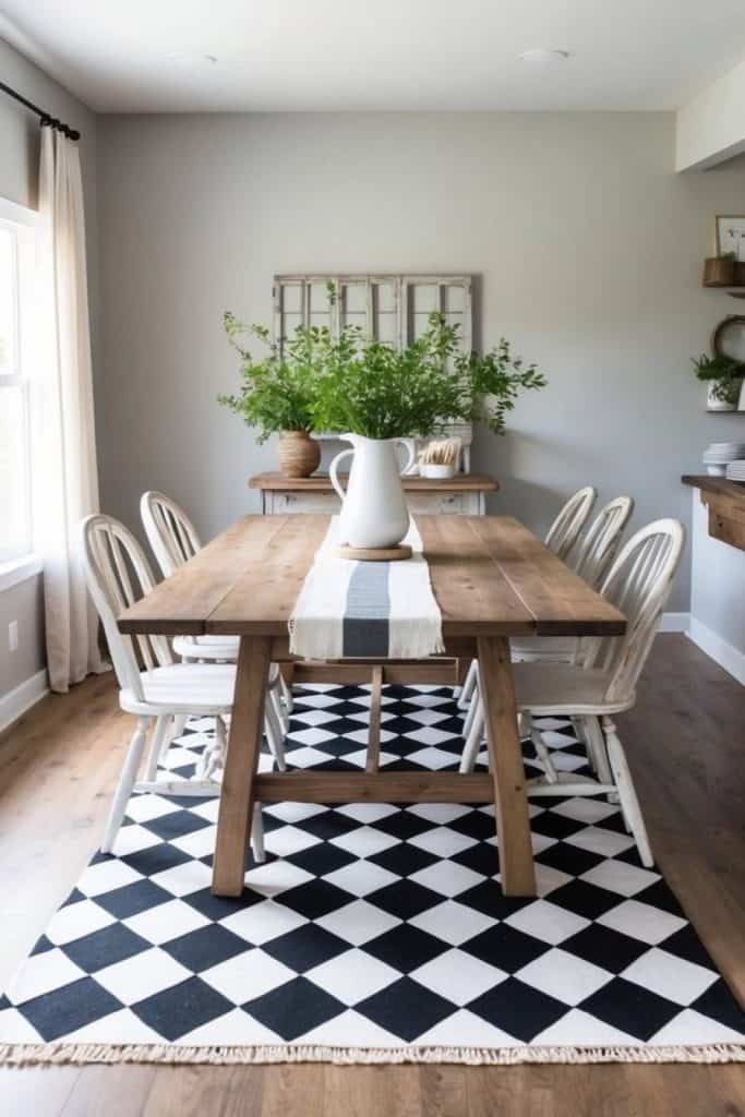 A charming checkerboard rug can add a playful touch to your farmhouse dining room. Its vintage-inspired pattern brings cozy vibes and rustic elegance to the space.