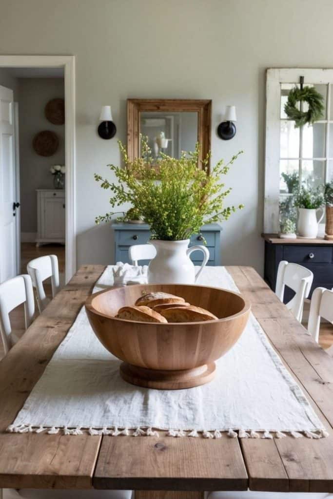 A charming wooden bread bowl adds rustic flair as a dining table centerpiece. Fill it with seasonal fruits, fresh flowers, or faux greenery for an eye-catching display.