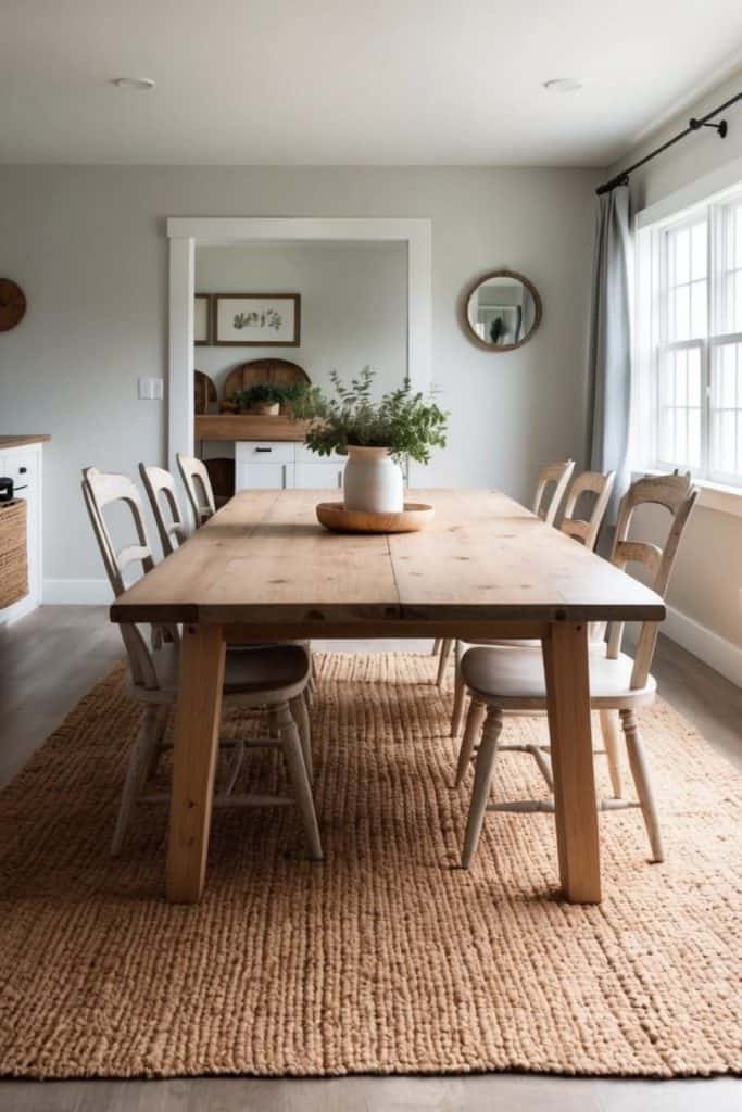 A cozy wool rug adds warmth and texture to a farmhouse dining room. Its natural fibers bring an organic, rustic feel that perfectly complements wooden furniture.