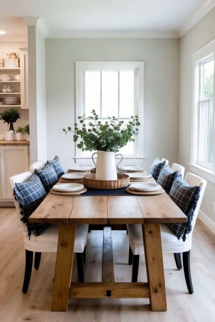 Cozy plaid cushions add a dash of farmhouse flair to dining chairs. They bring a cheerful pop of color and pattern that instantly warms up the space.