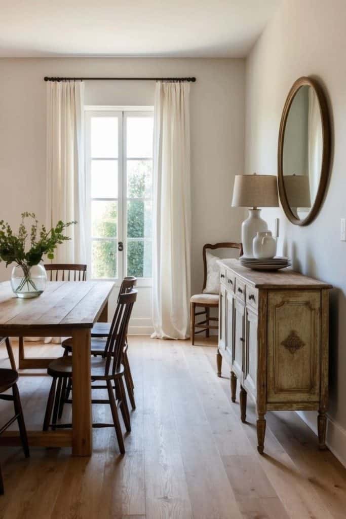 A charming antique sideboard brings timeless elegance to any farmhouse dining room. Its weathered wood and vintage hardware add character and rustic appeal.