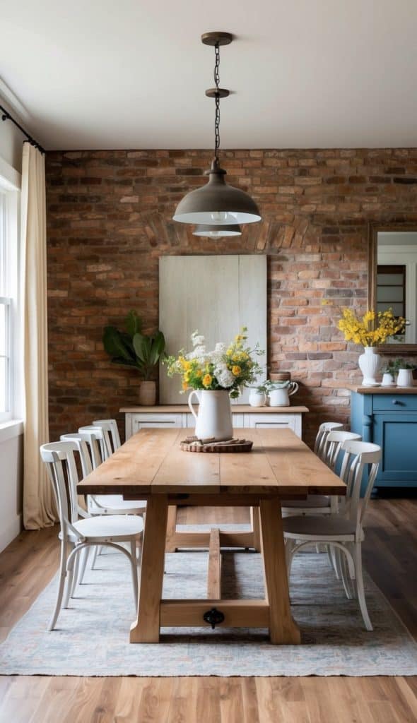 An exposed brick wall adds rustic charm and character to a farmhouse dining room. Its warm, earthy tones create a cozy atmosphere perfect for family meals and gatherings.