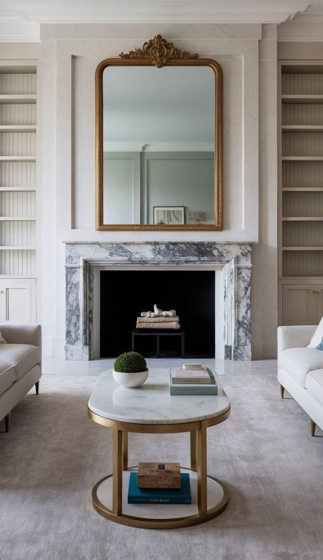 A perfectly centered fireplace creates a captivating focal point, drawing eyes to its elegant symmetry. Matching built-ins flank each side, offering storage and display space while maintaining visual harmony.