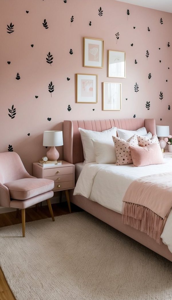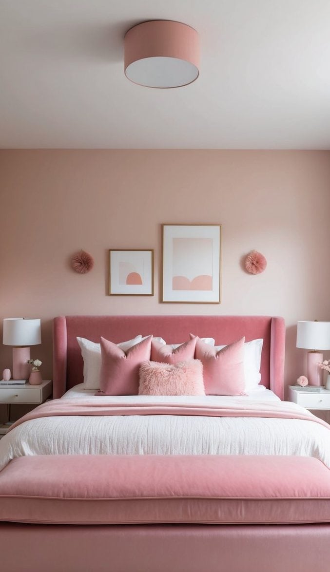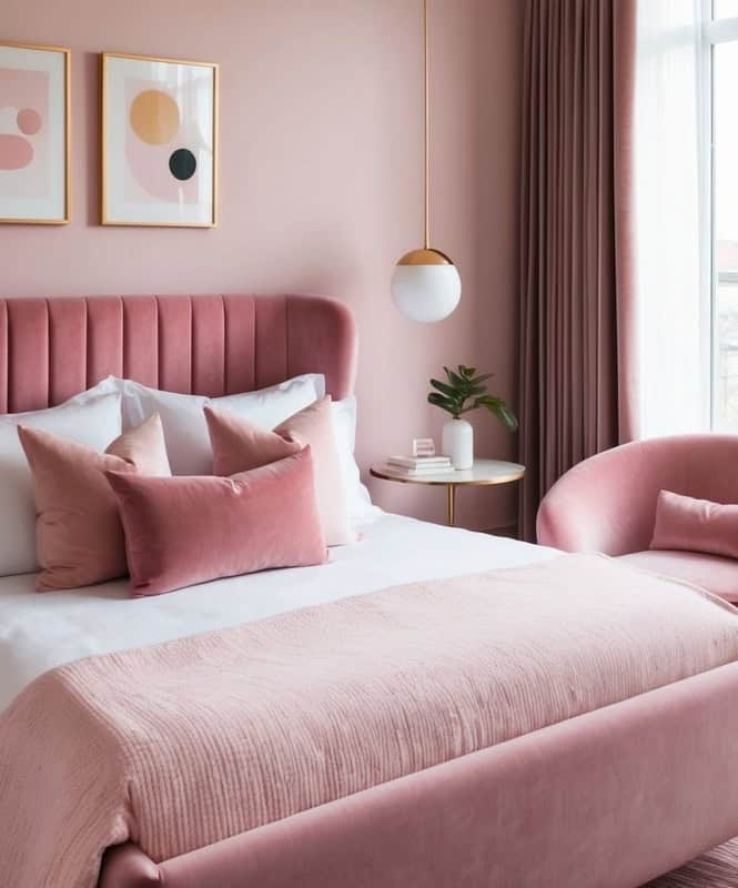 A cozy bedroom with blush pink walls, a plush velvet bed, and soft pink accents throughout