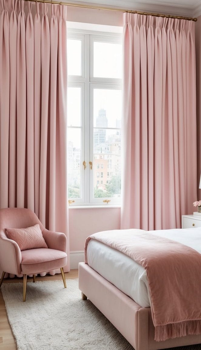 A plush pink armchair with a textured pillow creates a cozy nook, paired with flowing curtains and soft gold accents that enhance the room’s serene elegance.