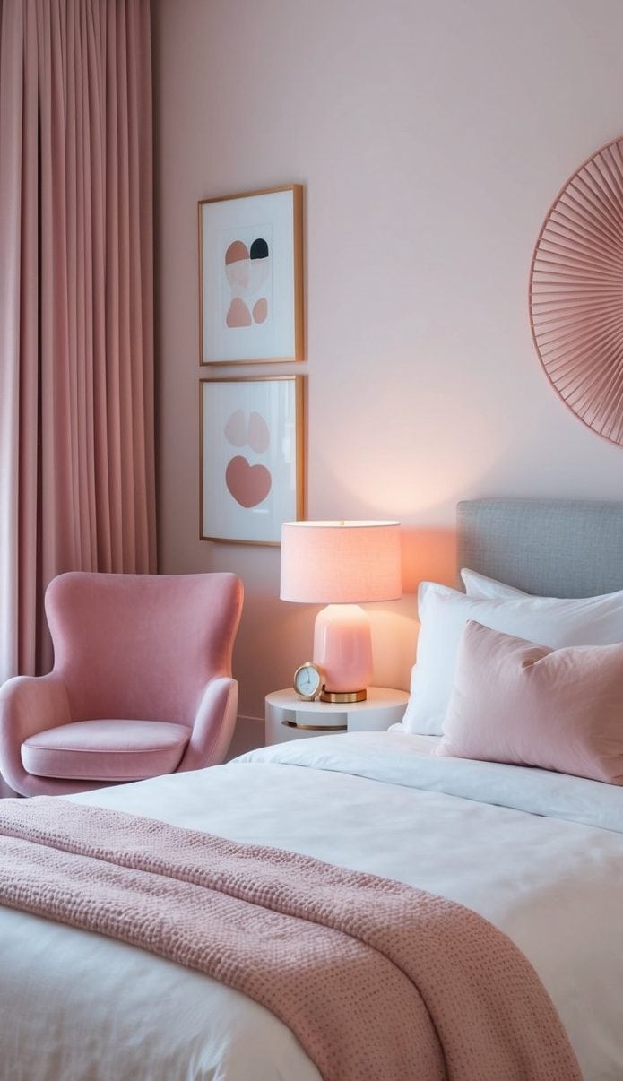 The elegant blush armchair creates a cozy statement, while soft pink bedding, abstract wall art, and a glowing pink lamp add warmth and sophistication to the serene bedroom.