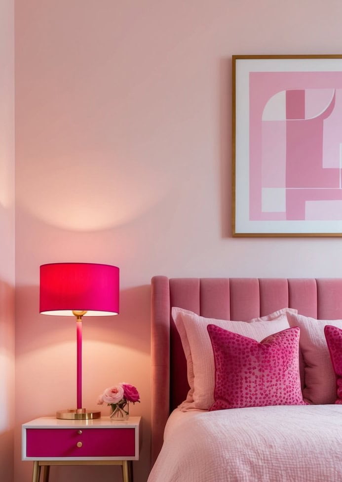 The bold pink-framed artwork above the bed adds a playful touch, while the tufted velvet headboard, soft pillows, and gold accents create a polished and inviting pink haven.
