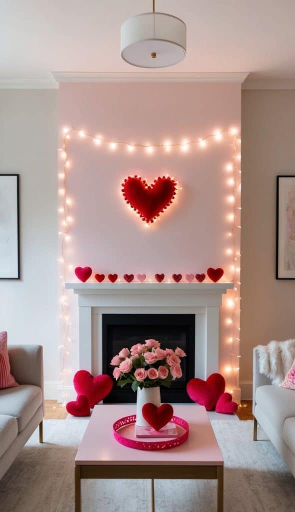 Delicate strands of soft pink fairy lights draped across the mantel create a dreamy, romantic glow perfect for Valentine’s Day decor.