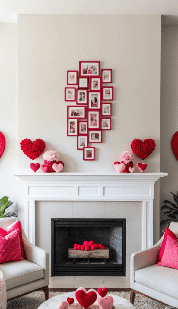 A bold arrangement of red frames creates a striking vertical photo collage above the mantel, celebrating love and cherished moments. Fluffy heart accents, soft florals, and cozy seating enhance the romantic Valentine’s Day vibe.