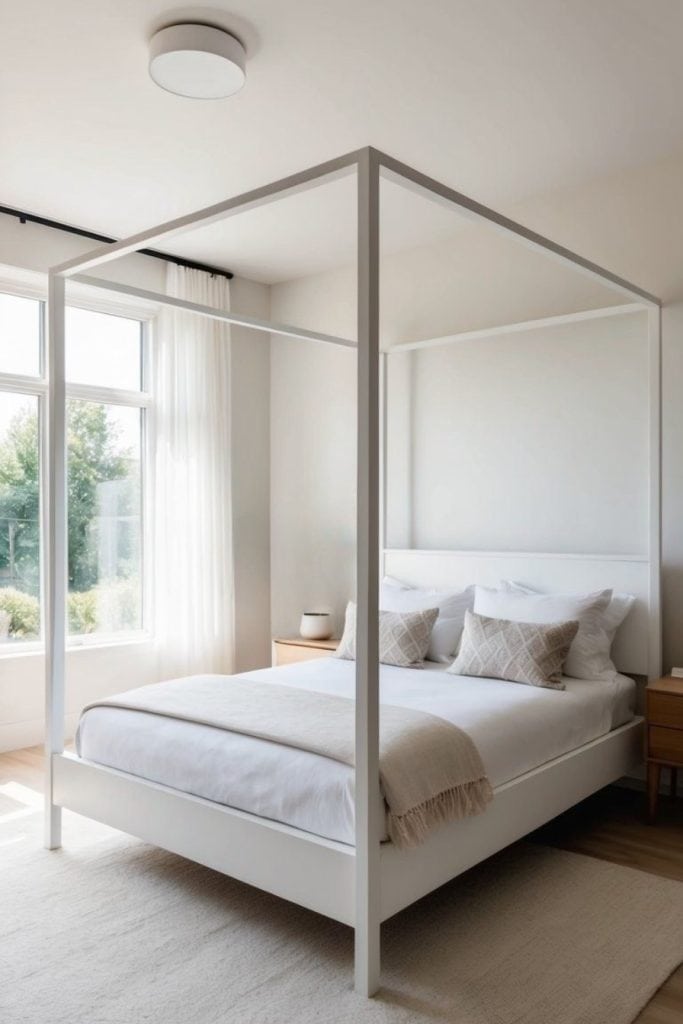 A dreamy white canopy bed frame transforms any bedroom into a romantic retreat. Flowing sheer curtains draped gracefully around the frame create a soft, ethereal look.