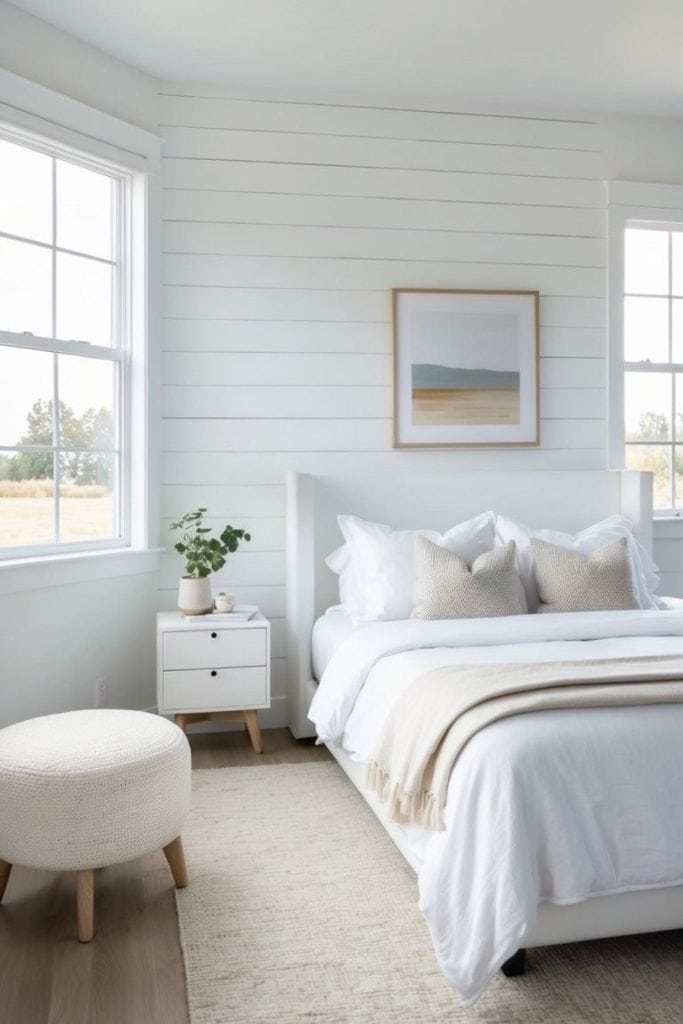 A dreamy white shiplap accent wall adds instant coastal charm to any bedroom. The crisp, clean lines create a soothing backdrop that’s perfect for showcasing colorful artwork or statement decor pieces.
