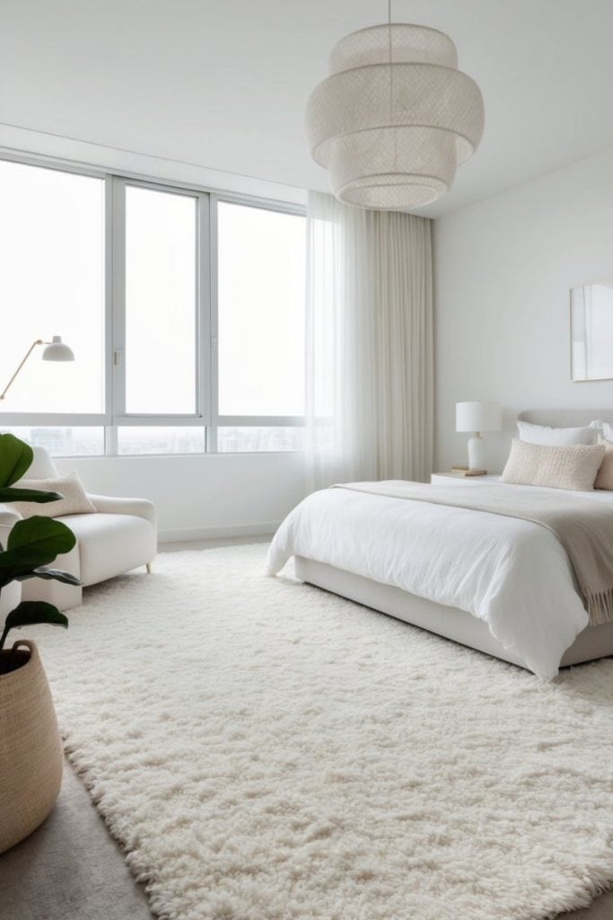 A plush, frosted white shaggy carpet adds a dreamy softness underfoot in a white bedroom. The fluffy texture creates a cozy, cloud-like feel that’s perfect for sinking your toes into on chilly mornings.